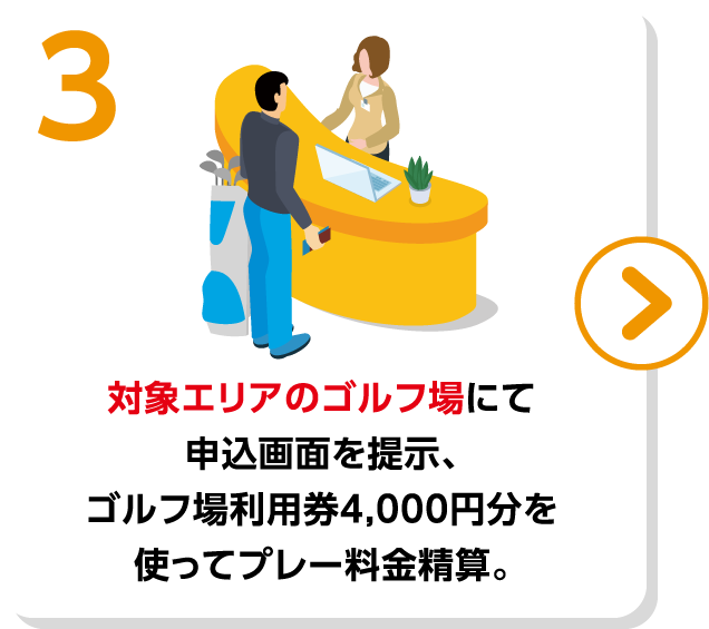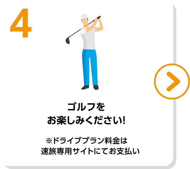 1.アコーディアWebにて対象のゴルフ場を予約しNEXCO中日本「速旅」専用サイトでドライブプランを申し込み、2.発着エリアから高速道路をつかっておでかけ、3.対象エリアのゴルフ場にて申込画面を提示、ゴルフ場利用券4,000円分を使ってプレー料金精算。4.ゴルフをお楽しみください!※ドライブプラン料金は速旅専用サイトにてお支払い