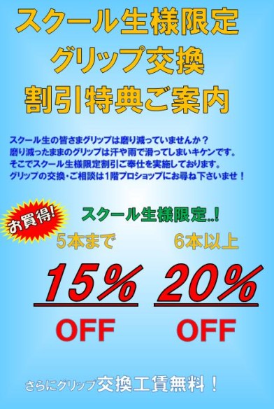 スクール生様限定、”グリップ交換割引キャンペーン”を実施しております。グリップをお求め頂き、交換ご希望のスクール生様に5本まで15%OFF、6本以上の交換ご希望の場合、なんと20%OFFの割引にてご奉仕致します。