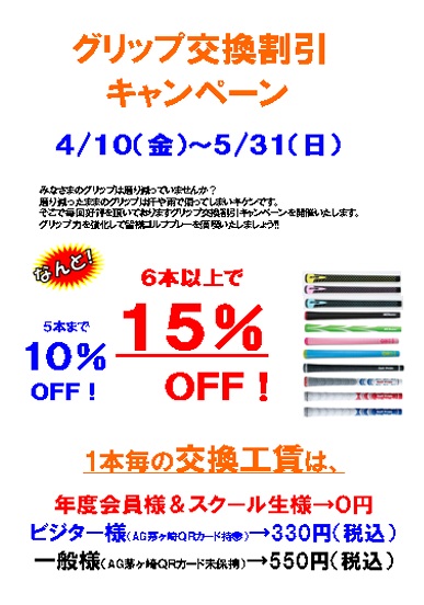 4月10日(金)から5月31日(日)までの期間中、グリップをご購入頂きグリップ交換ご希望のお客様に、グリップ店頭販売価格からさらに10%割引にてご奉仕しております。