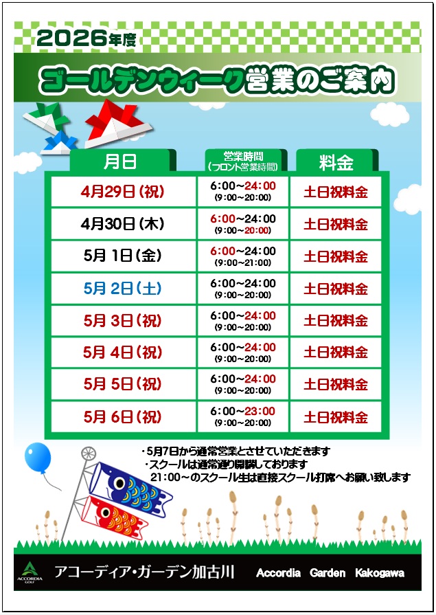 ゴールデンウィーク🎏期間中の営業時間・料金のご案内をさせていただきます。
