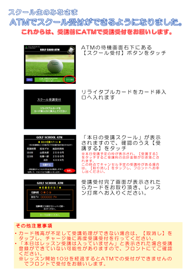 今後は、受講前にATMにて受付を行ってから打席へお入りください。