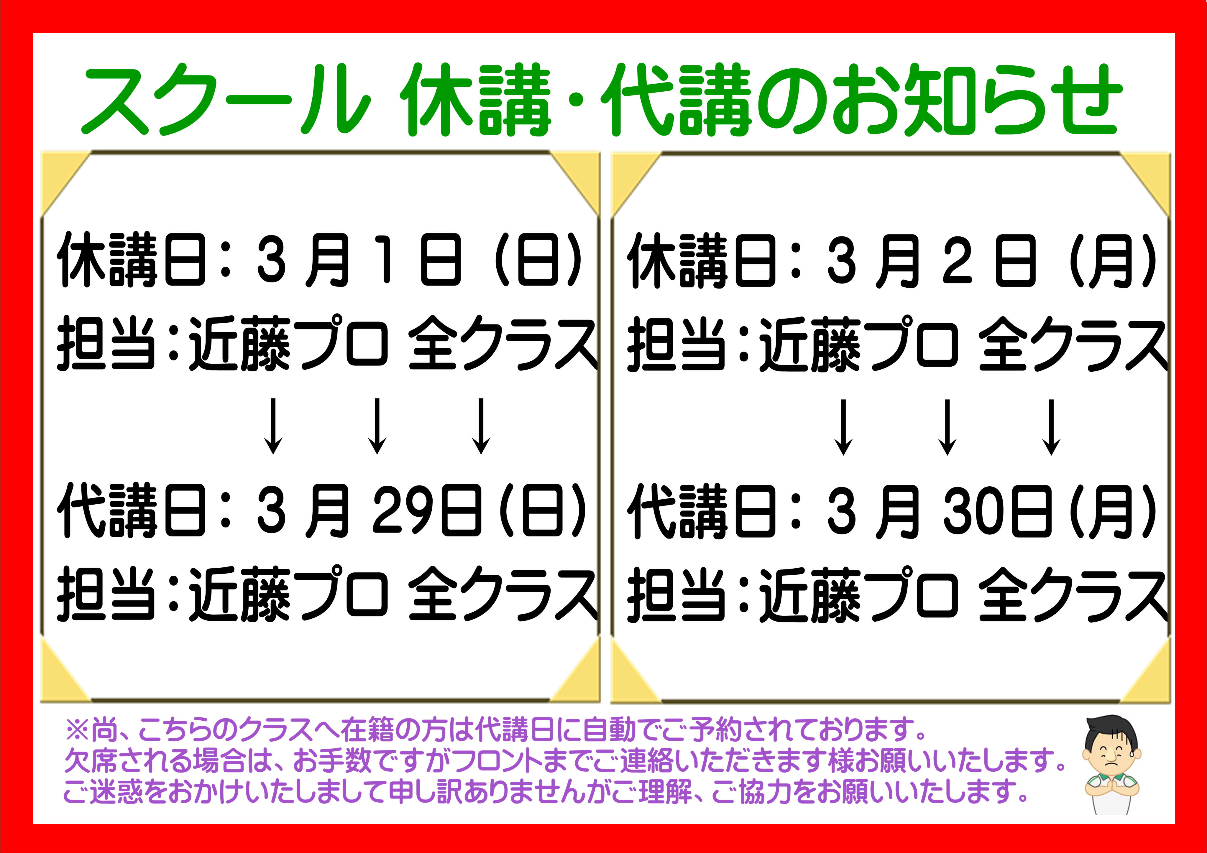 休講日: 3月1日 (日) 近藤プロ 全クラス
