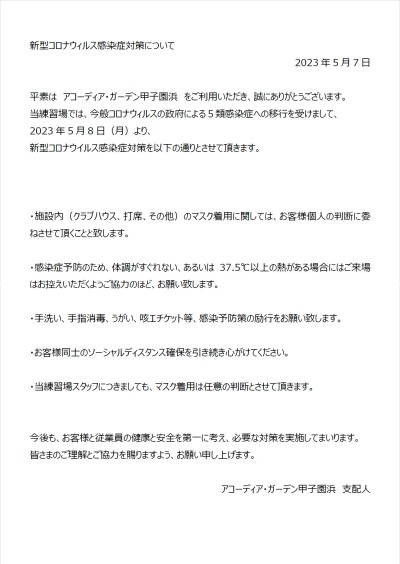 5/8(月)より新型コロナウィルス感染症対策を緩和させて頂きます。