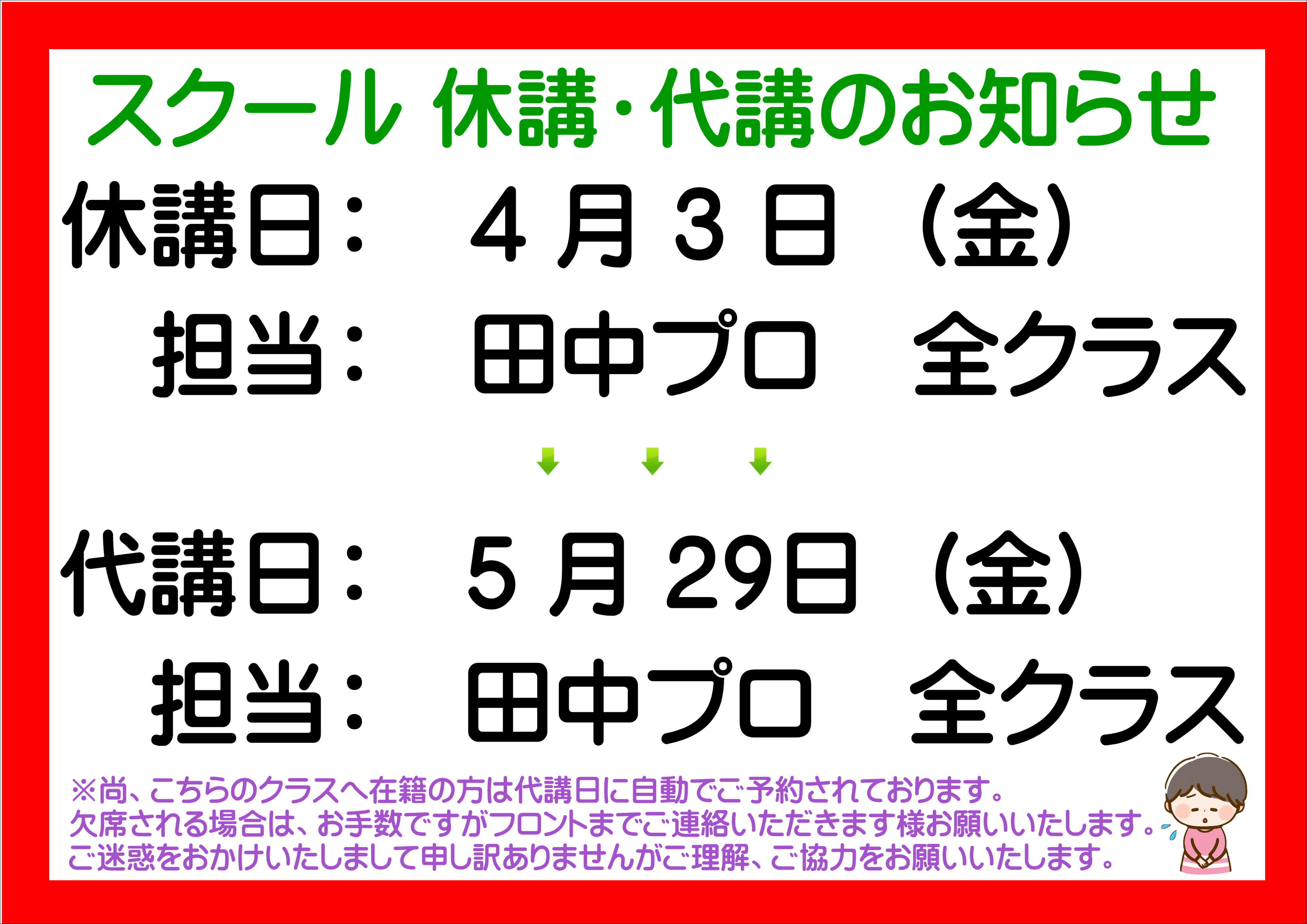 休講日 4/3 (金) 田中プロ 全クラス