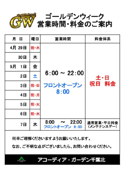 4/29(水・祝)~5/6(水・祝)までの営業時間のご案内です。