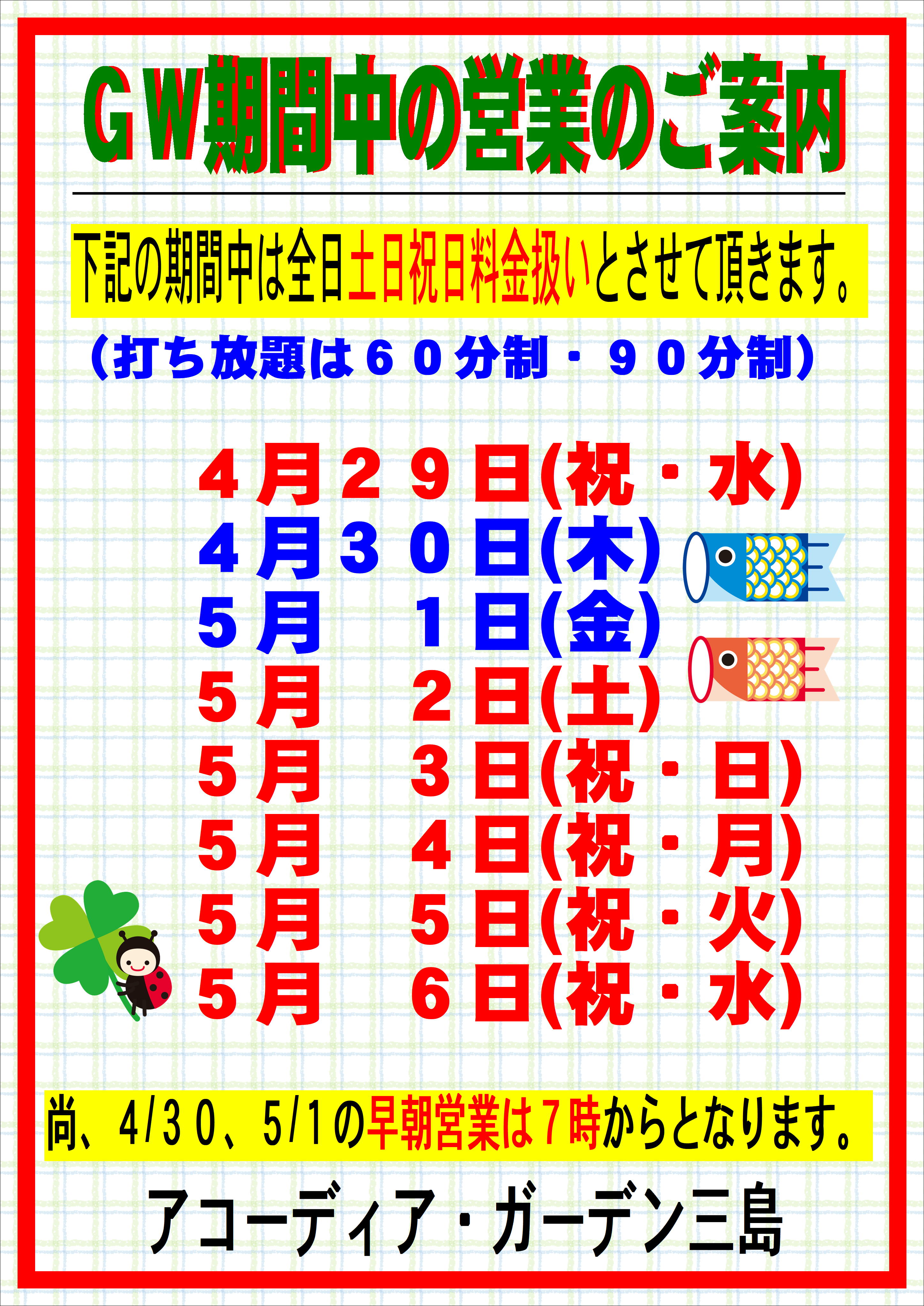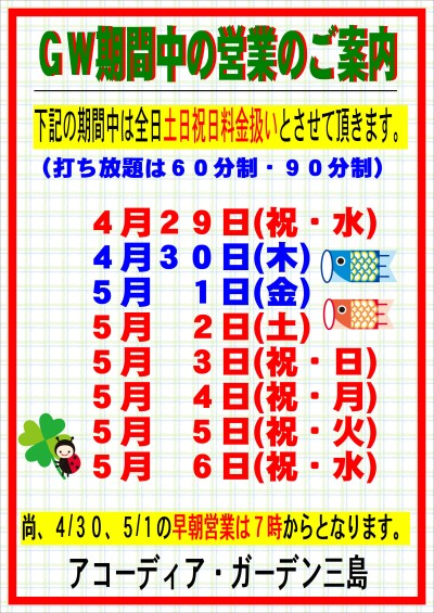 尚、4/30(木)、5/1(金)の早朝セルフ営業(1球打ち限定)は午前7時から午前9時となりますので