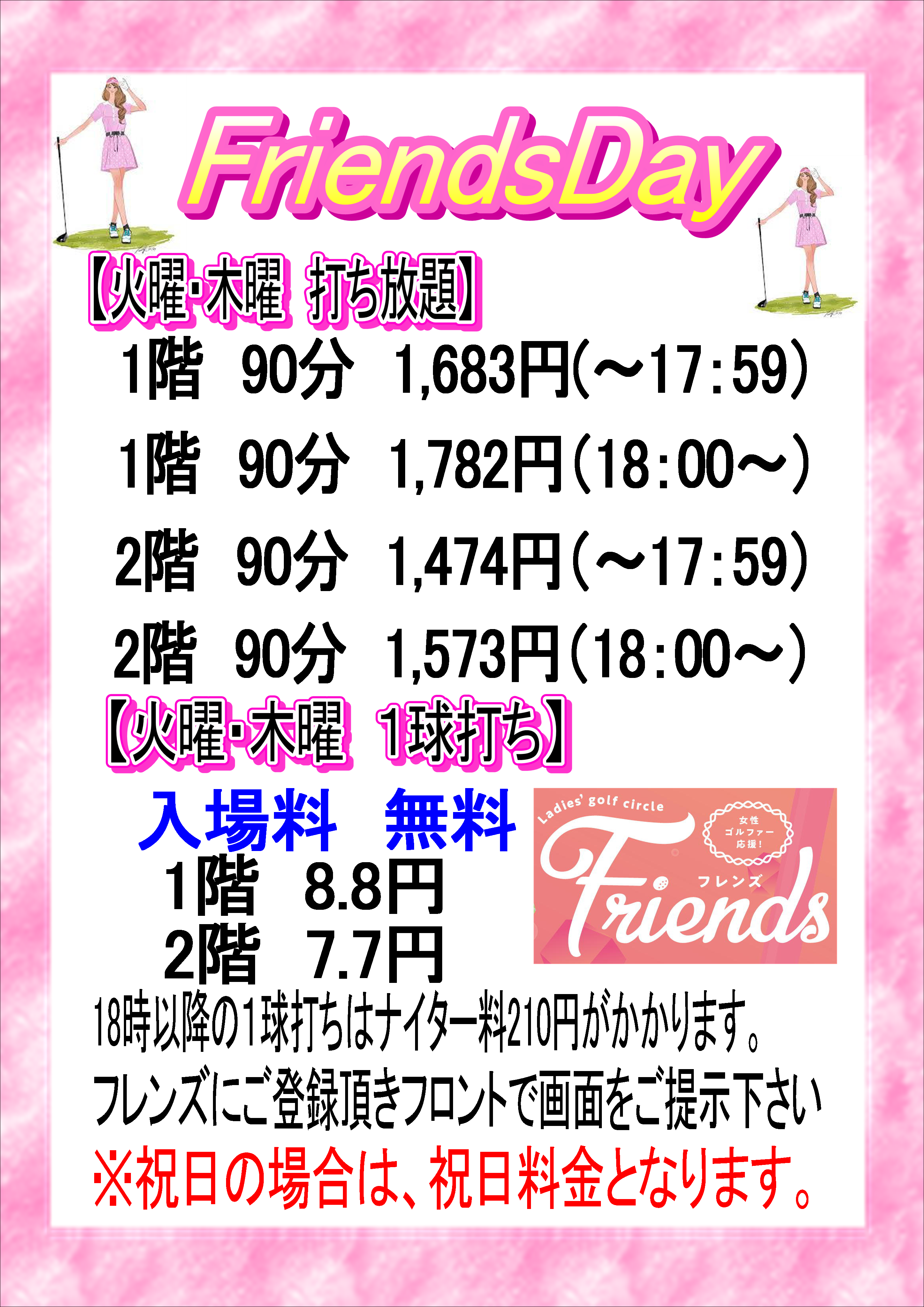 フレンズ会員にご登録いただいてる方限定で火曜日・木曜日は、お得な料金で練習ができます。