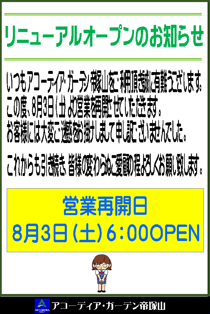 この度、2024年8月3日(土)朝6:00より営業を再開させていただきます。