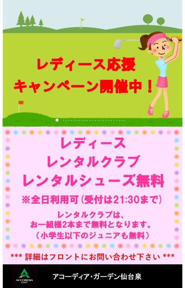 レディース、ジュニアのレンタルクラブをお一組様2本まで無料にてお