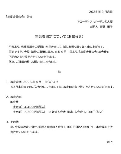 「年度会員の会」年会費改定