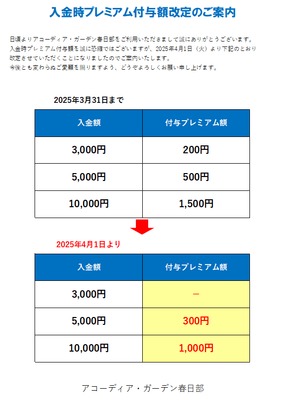 入金時プレミアム付与額を誠に恐縮ではございますが、