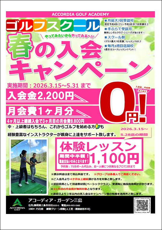 大変お得な、ゴルフスクール春の入会キャンペーンのご案内です。