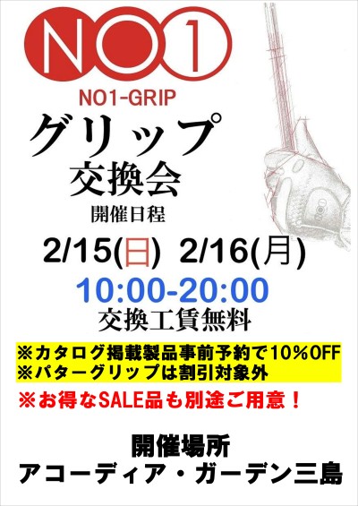 ☆NO1グリップカタログ掲載製品(ウッド用、アイアン用)は2/14迄事前予約で定価から10%割引。