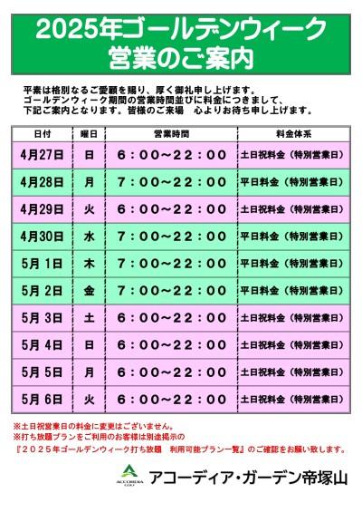 2025年ゴールデンウィーク期間中の営業時間について右記掲載画像のご案内となります。