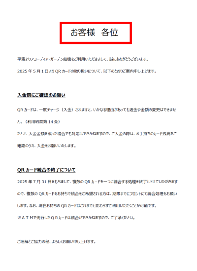 2025年7月31日をもちまして、複数のQRカードを一つに統合する処理を終了とさせていただきますので、複数のQRカードをお持ちで統合をご希望される方は、期限までにフロントにて統合処理をお願いします。なお、現在お持ちのQRカードはこれまでと変わらずご利用いただくことが可能です。