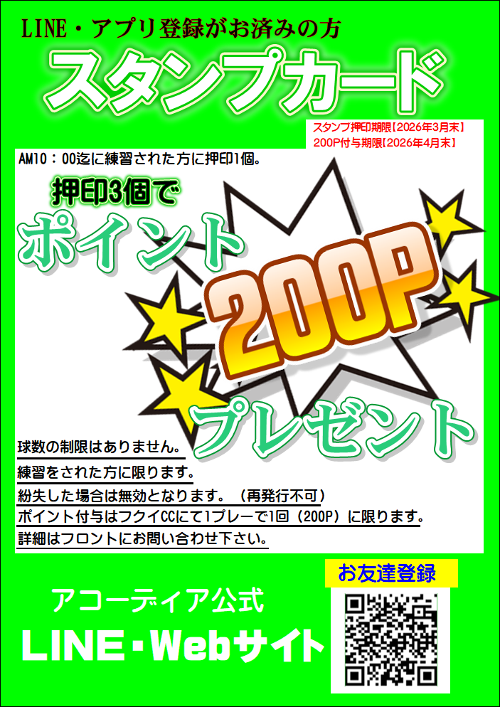 お得にポイントを溜めましょう。AM10:00迄に練習をされた方に1個押印いたします。打球制限はありません。押印3個でフクイCCにて200ポイント付与。詳細は練習場スタッフにお問い合わせください。