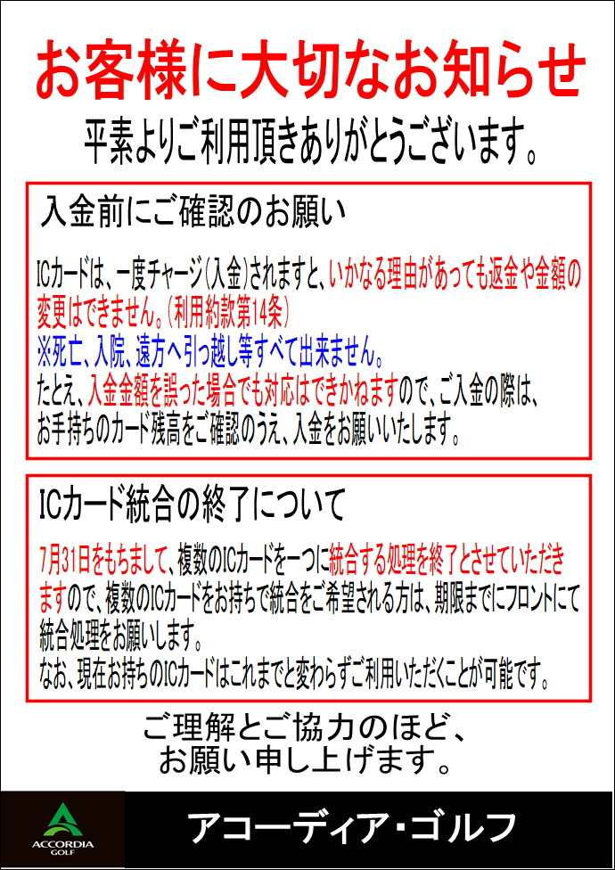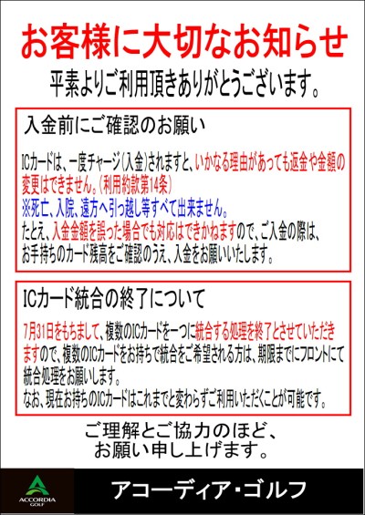 ますので、複数のICカードをお持ちで統合をご希望される方は、期限までにフロントにて