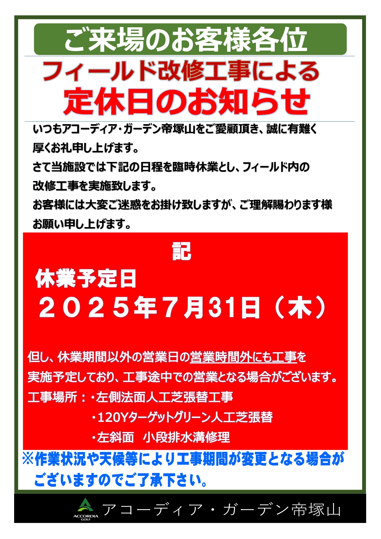 さて当施設では2025年7月31日(木)を休業とし、フィールド内の改修工事を実施致します。