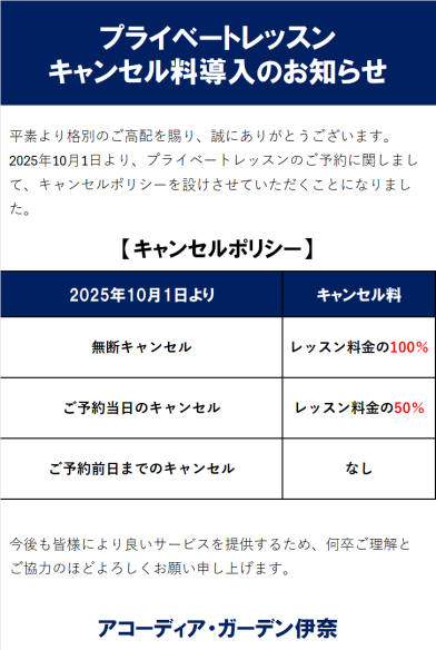ご予約当日のキャンセル キャンセル料/レッスン料金の50%