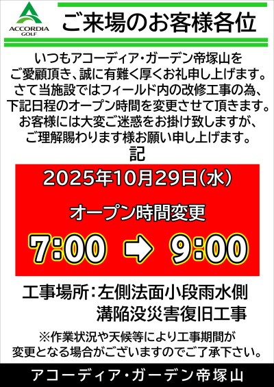 当施設では、フィールド内の改修工事の為、下記日程のオープン時間を変更させて頂きます。