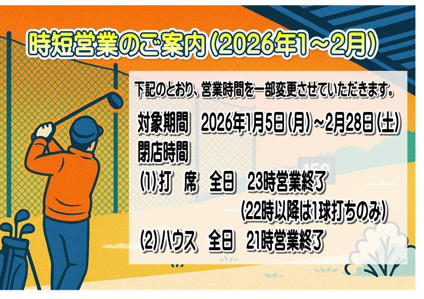 当練習場は1/5(月)から2/28日(土)までを冬期営業期間とし、以下の通り営業時間を変更させて頂きます。