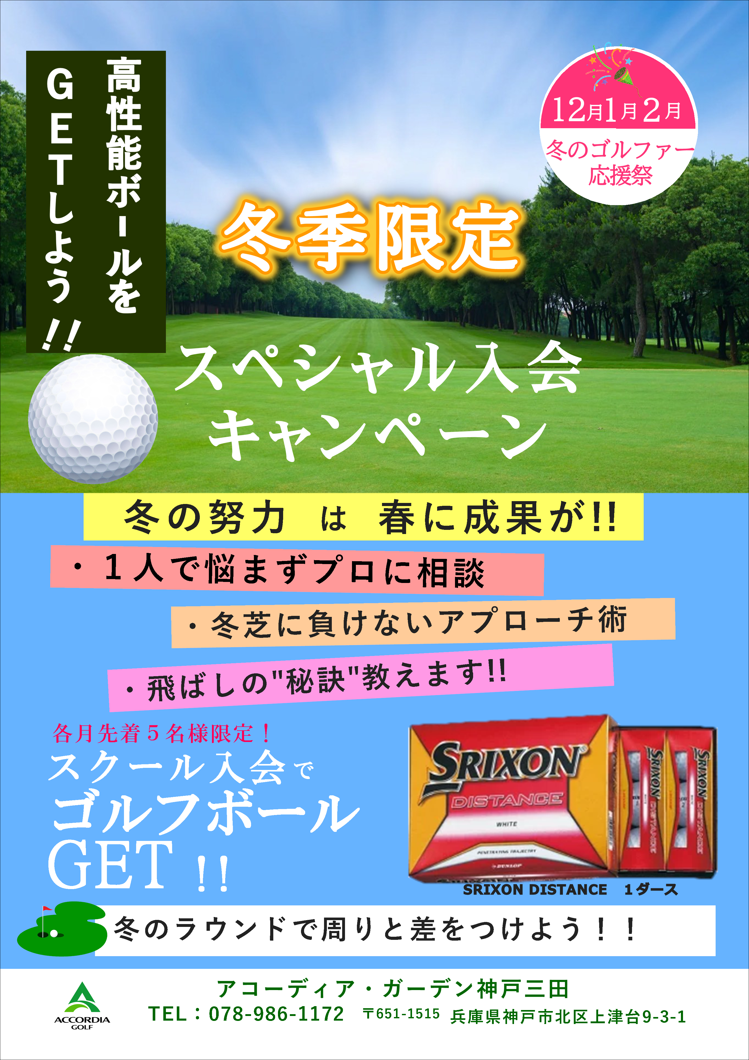 今スクールにご入会頂くと、毎月先着5名様までボール1Dz(スリクソンディスタンス)をプレゼント中!