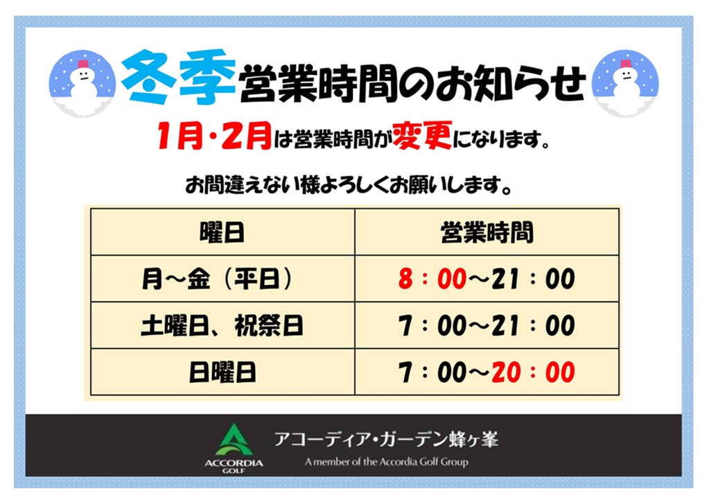 1月・2月は冬季営業のため、営業時間が変更となります。お間違いのないようにお願い致します。皆様のご来場お待ち申し上げております。