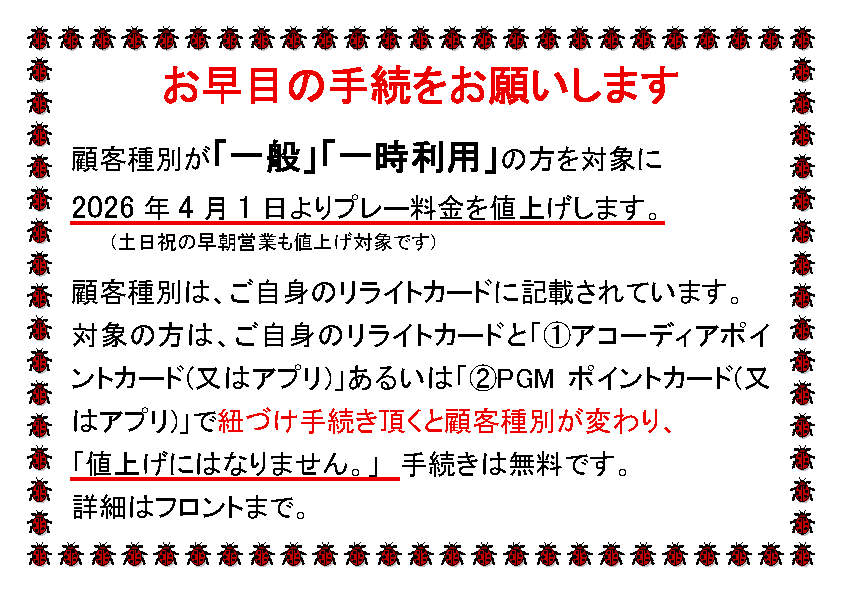 対象の方は、ご自身のリライトカードと「①アコーディアポイントカード(又はアプリ)」あるいは「②PGMポイントカード(又はアプリ)」で紐づけ手続き頂くと顧客種別が変わり、