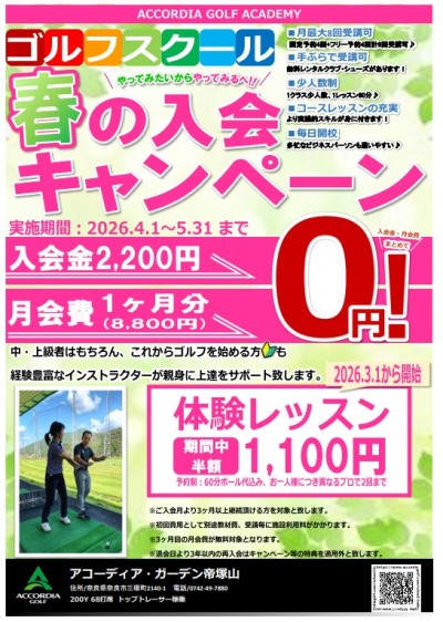 アコーディア・ガーデン帝塚山より春のスクール新規入会キャンペーンのお知らせ致します。