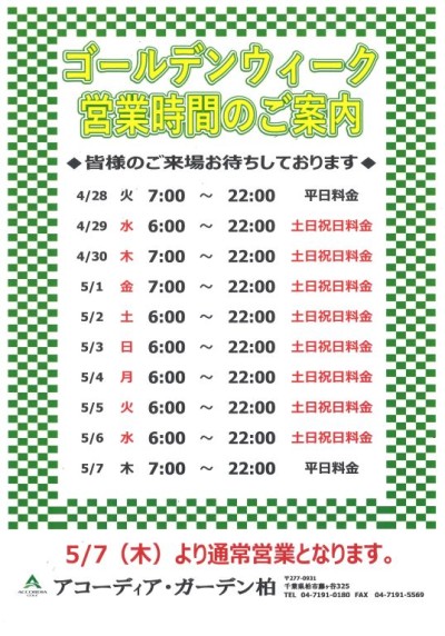 ゴールデンウィーク営業時間はご案内の通りとなります。