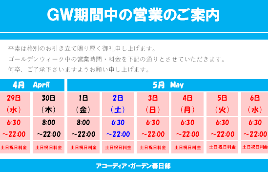 ゴールデンウィーク中の営業時間ならびに料金を右記の通りとさせていただきます。
