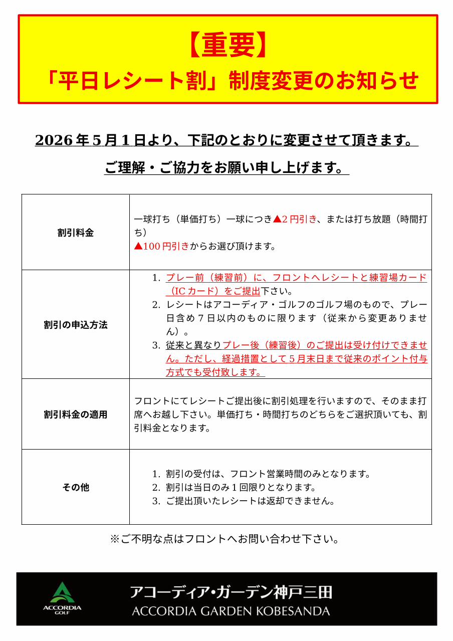 ご好評を頂いているアコーディア・ゴルフでのプレーのレシートをお持ちの方へのサービスですが、2026年5月1日から仕組みが変わります。