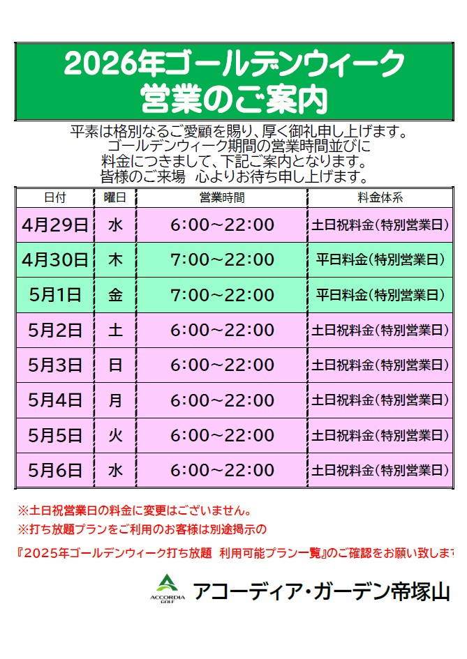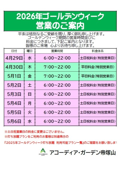 2026年ゴールデンウィーク期間中の営業時間について右記掲載画像のご案内となります。