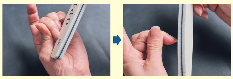 利き手の爪をヤスリがけする場合は、ヤスリではなく、指(爪)のほうを動かすのがポイントだ。