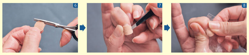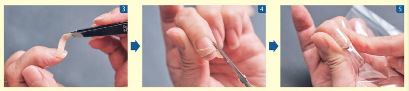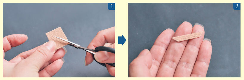 そこで、テーピングで割れた爪をしっかりとカバー。爪のサイズに合わせた細い短冊状と、四角に切って角を落としたテープを用意する。